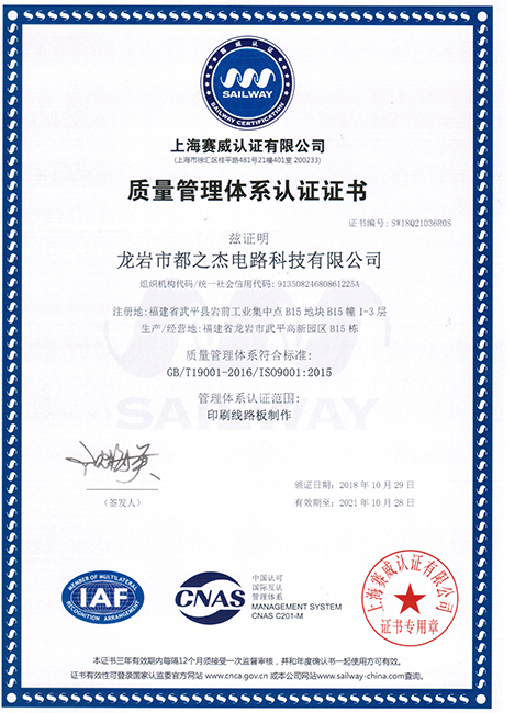 自1997年成立以來,都之杰已經(jīng)獲得ROHS產(chǎn)品認證,各項技術(shù)指標達到國家先進水平,質(zhì)量和信譽是企業(yè)的生命,我們一直以來持續(xù)不斷改善產(chǎn)品的質(zhì)量,以質(zhì)量取勝市場,提高公司的信譽度。多年來憑優(yōu)良的產(chǎn)品質(zhì)量、準時快捷的供貨和周到細致的服務(wù),深得國內(nèi)外客戶的好評。我們已經(jīng)獲得良好的聲譽和客戶的信任,并逐漸成為客戶可信賴的、能長期合作的印刷線路板戰(zhàn)略合作供應商。我們堅持向國內(nèi)外先進企業(yè)學習并不斷提升自主創(chuàng)新。公司擁有經(jīng)驗豐富及穩(wěn)定的團隊,視質(zhì)量為企業(yè)生命,嚴格推行ISO9001質(zhì)量管理體系,符合ROHS標準,并獲得了UL安全認證、TS16949和CQC認證。